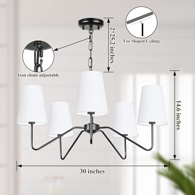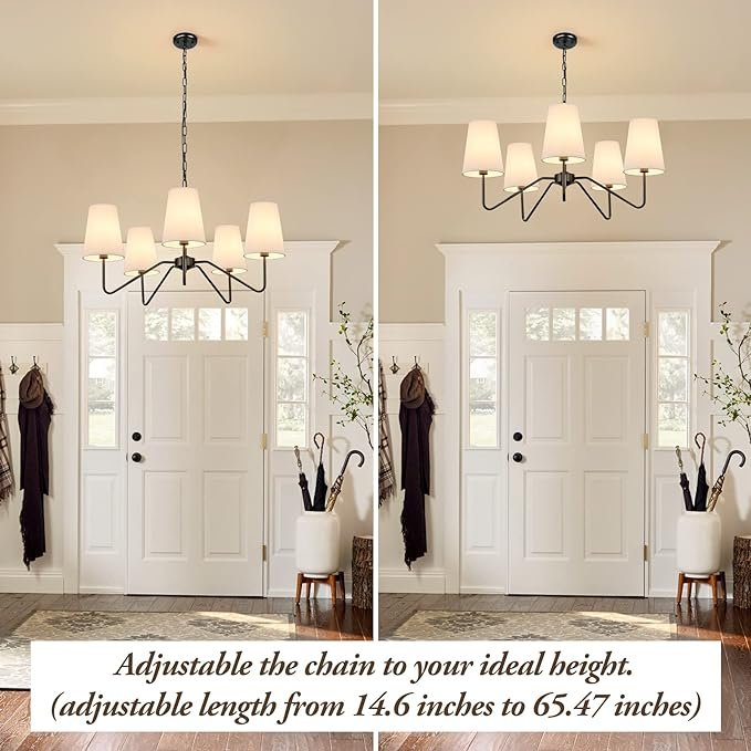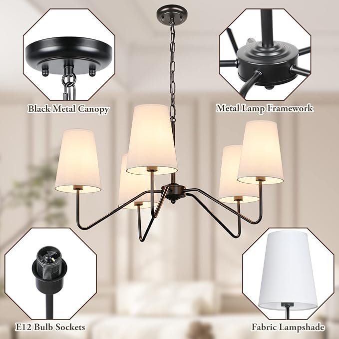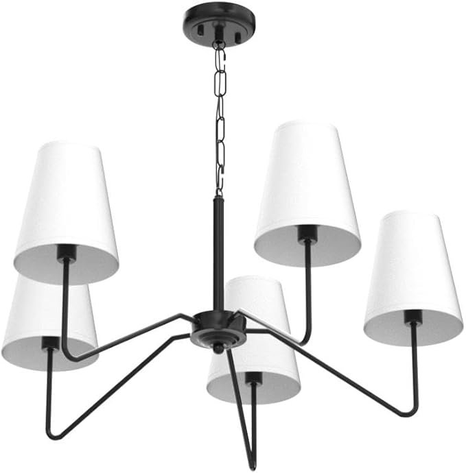 - 【Stylish & Modern Light Fixture】Adopting a clean, minimalistic design concept, featuring 5 elegant curved arms that hold classic white fabric shades, this chandelier is an expert that bringing exuding modern chic charm to your space. This 5-light chandelier, with its clean lines and sleek matte black finish, will not only brighten your home, but also ideal decoration for foyer, entryway, dining room, living room, office, kitchen, bedroom, restaurant, hallway, studio, workshop, etc.