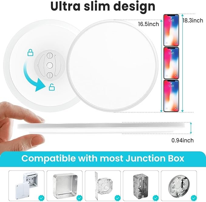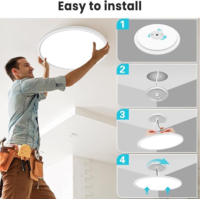 - Install is a Breeze:This white round bedroom lighting is hassle-free to install, eliminating confusion and tedious steps. The flat panel ceiling light base is designed with a rotating mounting plate, allowing for simple and quick installation.Attached security cable at the back serves an important safety function,preventing a full dislodge or fall.