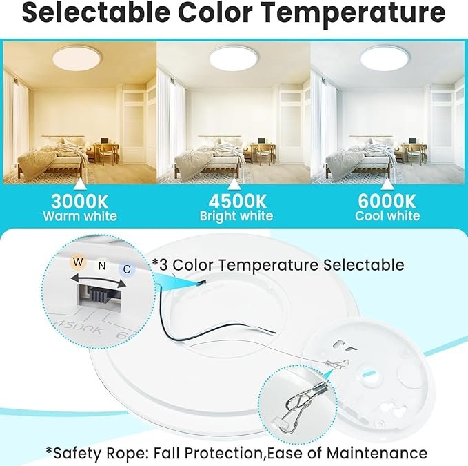 - 3-in-1 Color Temperature: Easily switch between warm white 3000K, neutral white4500K, and daylight white 6000K with a toggle switch for different room atmospheres.(Not dimmable).