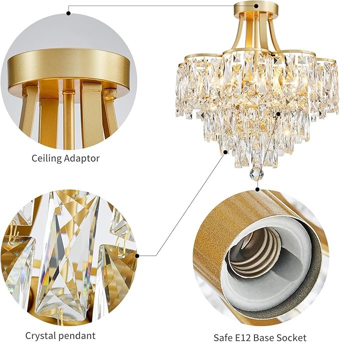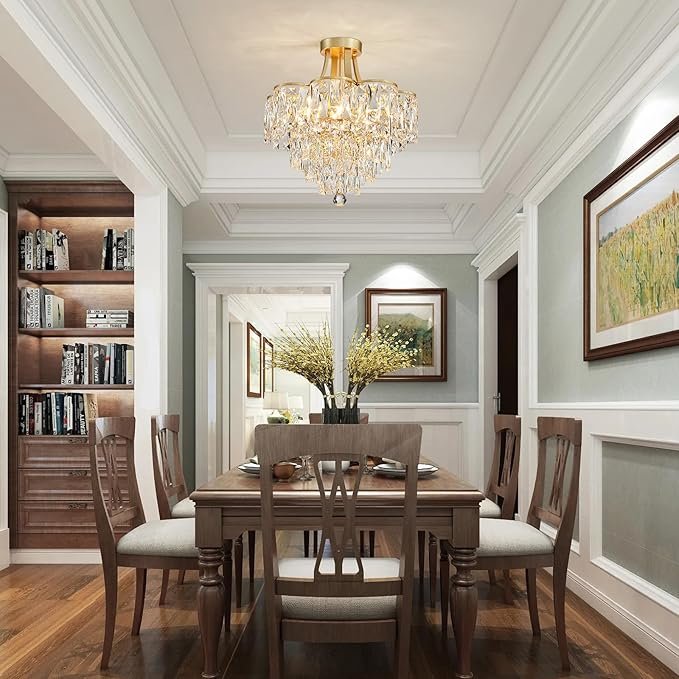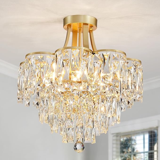WUZUPS Crystal Chandelier Semi-Flushmount Ceiling Light Modern Lighting Fixture for Bedroom Hallway Entry Kitchen Bathroom, H 19.3\" x W 18.3\", E12 Base, Gold