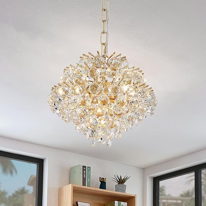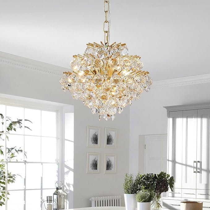 Bestier Gold Modern Pendant Chandelier Crystal Raindrop Lighting Ceiling Light Fixture Lamp for Dining Room Bathroom Bedroom Livingroom 4 G9 Bulbs Required D11 in x H12 in