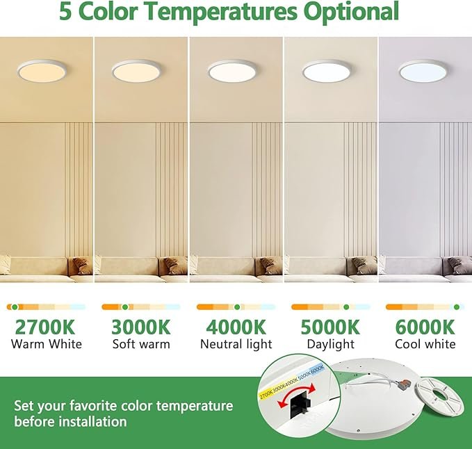 - CCT Selectable:This flush mount ceiling light fixture has 5 color temperatures optional:2700K/3000K/4000K/5000K/6000K, you can set your favorite color directly on the fixture before installation.