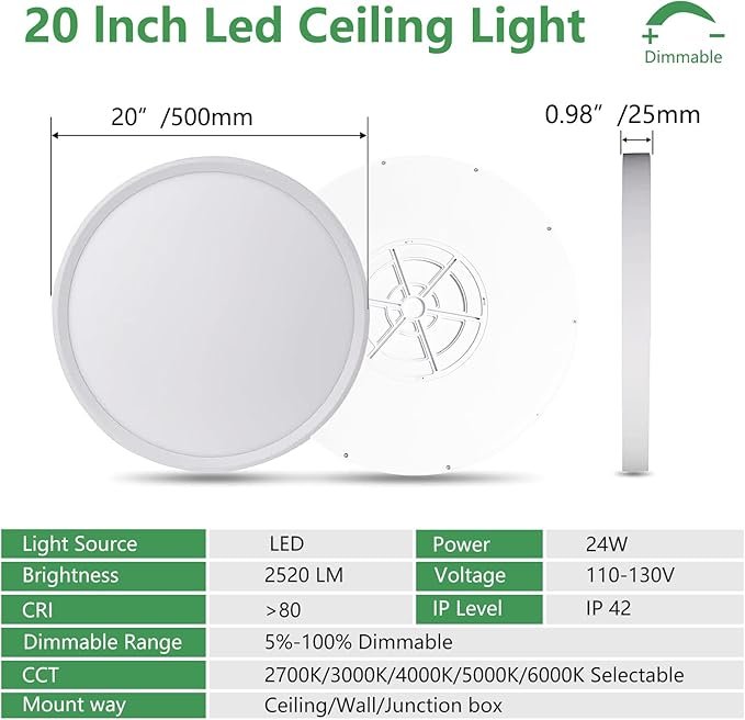 - 5%-10% Triac Dimmable-Adjustable Brightness: This 20 inch ceiling light fixture is dimmable from 5% to 100%, compatible with most standard dimmers, you are able to adjust the brightness easily as you like.