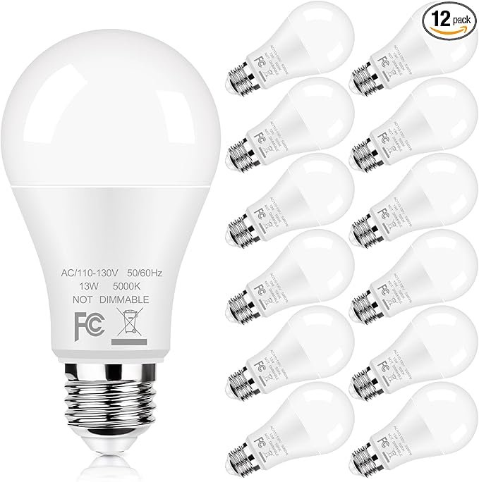 12-Pack A19 LED Light Bulbs, 100W Equivalent Bulbs, 13W 5000K Daylight White LED Bulbs with Standard E26 Medium Base, Super Bright 1500 Lumens, CRI85+, No Flicker Non-Dimmable Bulb for Lamp