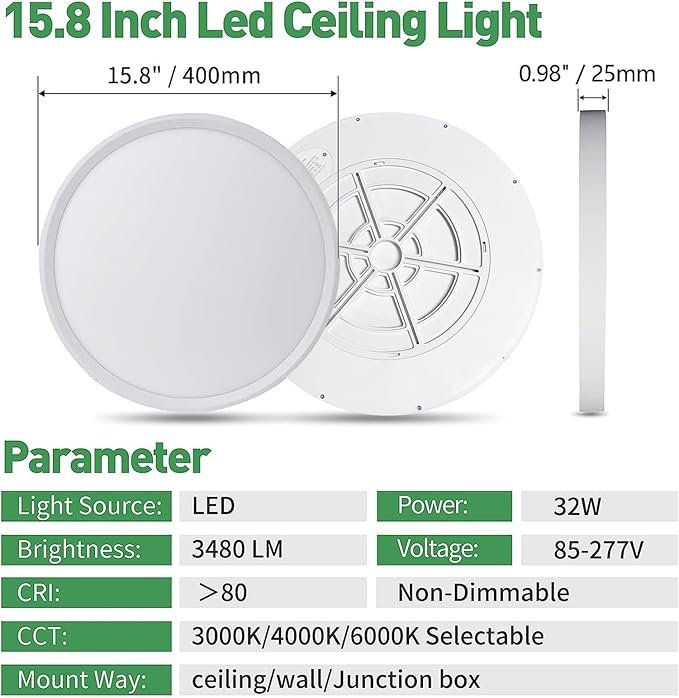 15.8 Inch LED Flush Mount Ceiling Light, 32W, 3480LM, 3000K/4000K/6000K CCT Selectable, Round Flat Panel Light Fits for Hallway, Kitchen, Bedroom, Laundry Room