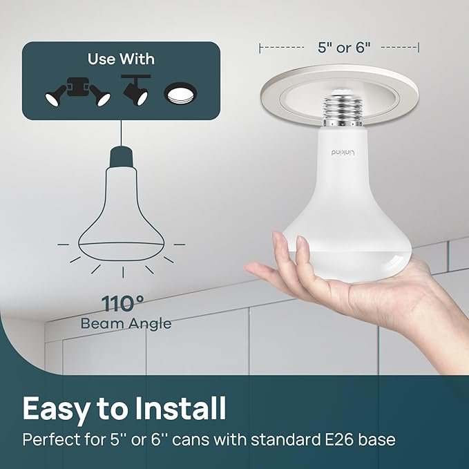 - Versatile Application – Effortlessly install Linkind 10 Watt BR30 LED indoor flood light bulbs into 5\” or 6\” recessed cans with standard E26 base. These BR30 flood light bulbs featuring a 110° wide beam angle are ideal for use in indoor recessed cans lights in bedroom, kitchen, living areas, offices, wall washes, or other occasions requiring bright recessed lighting.