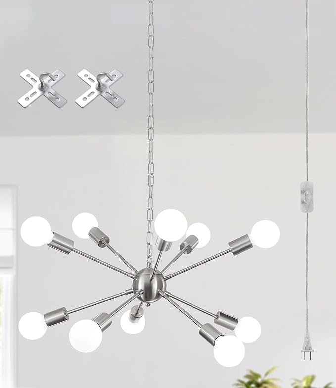 LASENCHOO 10 Lights Plug in Chandelier, Hanging Lights with Plug in Cord 16.4ft & On/Off Switch, Nickel Plug in Pendant Light, Modern Sputnik Chandeliers for Dining Room Living Room Bedroom