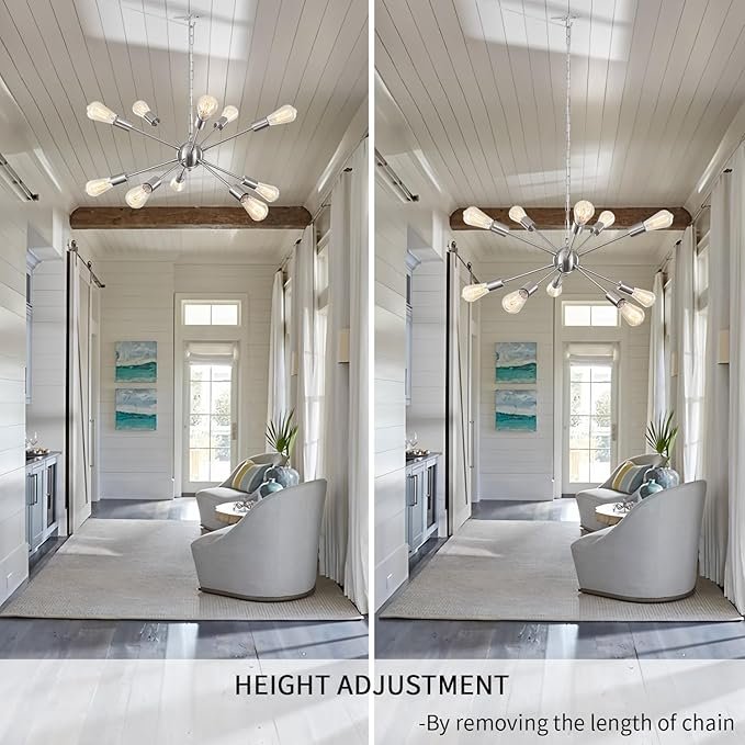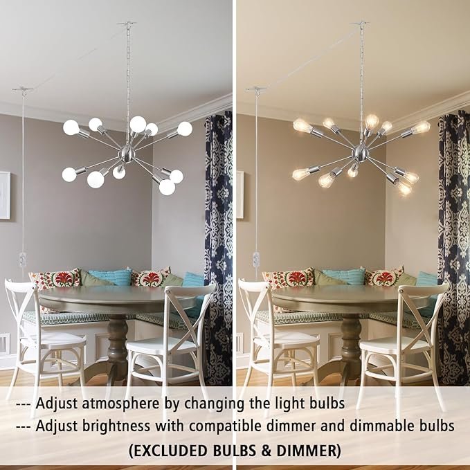 - 💡【Plug-In Hanging Light with ON/OFF Switch for Easy Installation】 All arms of 10 lights plug in chandelier lighting with cord are come pre-wired, just needing to screw them into the center ball one by one. The 4.92ft adjustable hanging chain and 16.4ft long plug-in cord make you adjust the height easily without any worry about the junction box.