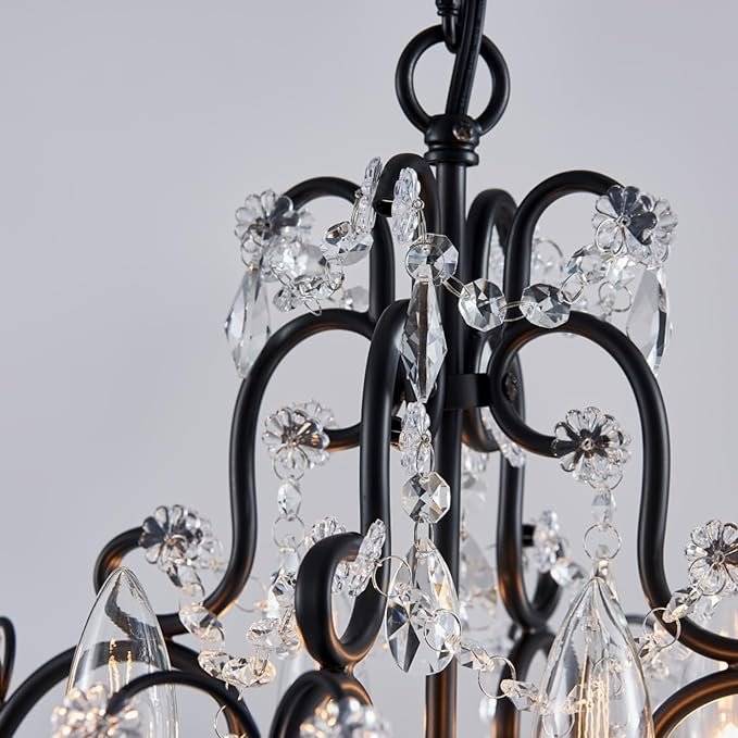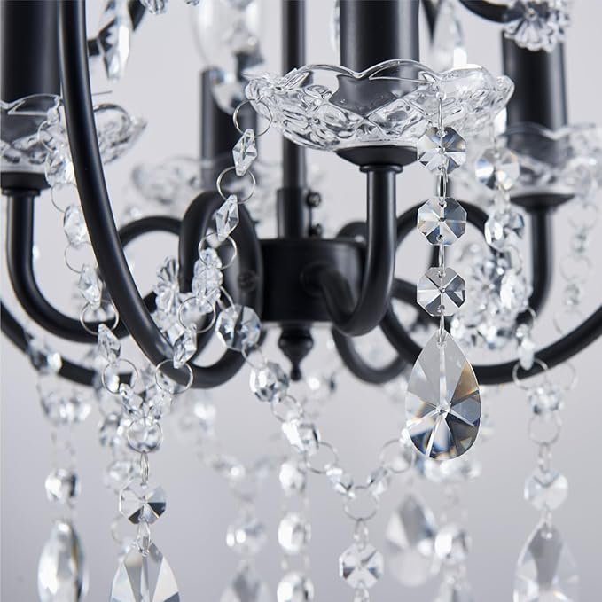 - The farmhouse chandelier light fixture is solidly made by glittering hanging clear crystal and modern black metal finish, and could light up your room extremely and widely to create a superior and classy atmosphere in your living room, dining room, bedroom, foyer or any other dry place.