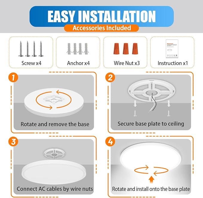 - FLUSH MOUNT LIGHTING INSTALLATION-Thin led round flat panel light can flush mount and surface mount for any ceiling area. Easy installation can be easily done by one person.