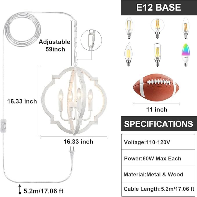 - ✅【Compatible with E12 Bulbs & Dimmable】This plug in hanging light fixture uses 4 x E12 base bulbs (up to 60W each, not included) and supports dimmable functionality when used with compatible dimmable bulbs and switches (not included). LED, incandescent, halogen, CFL, or Edison bulbs all work seamlessly.