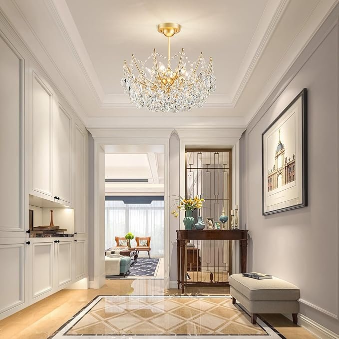 Crystal Ceiling Light Fixture, Modern Flush Mount Chandelier, 6-Lights Crystal Close to Ceiling Light, Gold Hallway Light Fixtures for Bedroom Kitchen Entryway Bathroom Dining Room Living Ro