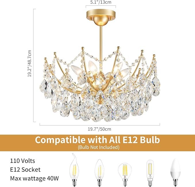 - Customizable Lighting: Semi flush mount ceiling light fixture is ONLY compatible bulbs with E12 sockets( Not included, Max 40W), such as incandescent, LED, CFL and halogen bulbs. Crystal chandelier lets you customize lighting ambiance with different bulb styles and color temperatures to suit your mood or activity.